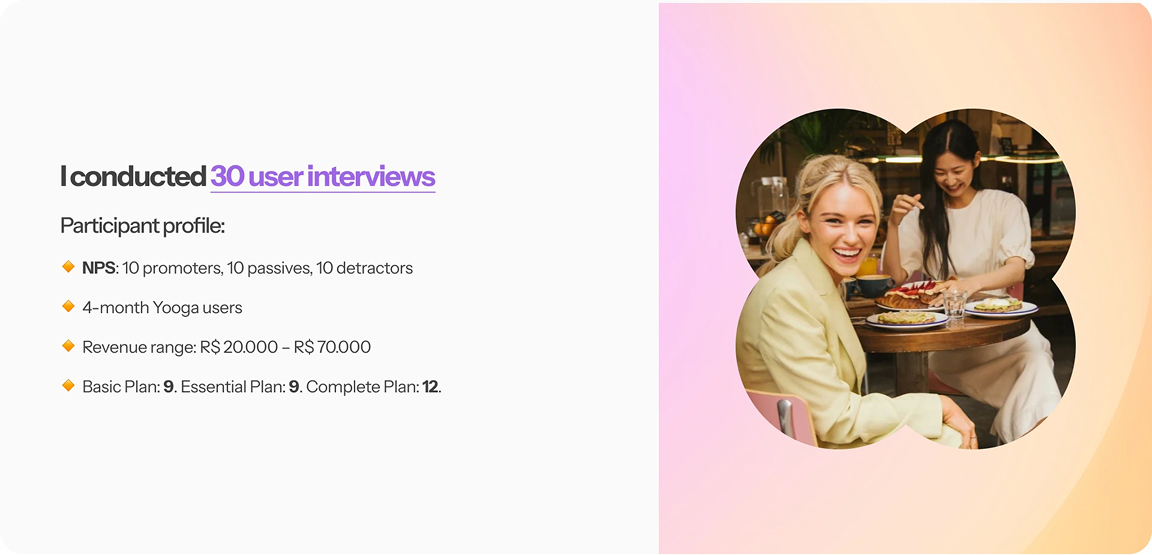 We gathered 6 users — 3 from the Essential plan and 3 from the Complete plan, all of whom had been with us for 4 months. The feedback was positive overall, and the gamification features stood out the most.